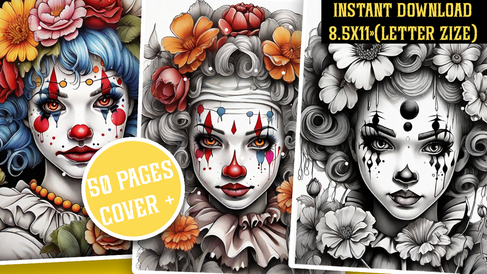 Escape into a world where the bizarre and the beautiful coexist with our 'Creepy Clown Flowers Girls Coloring Book.' It's an invitation to explore the unconventional and transform each page into a hauntingly beautiful masterpiece of your own creation.